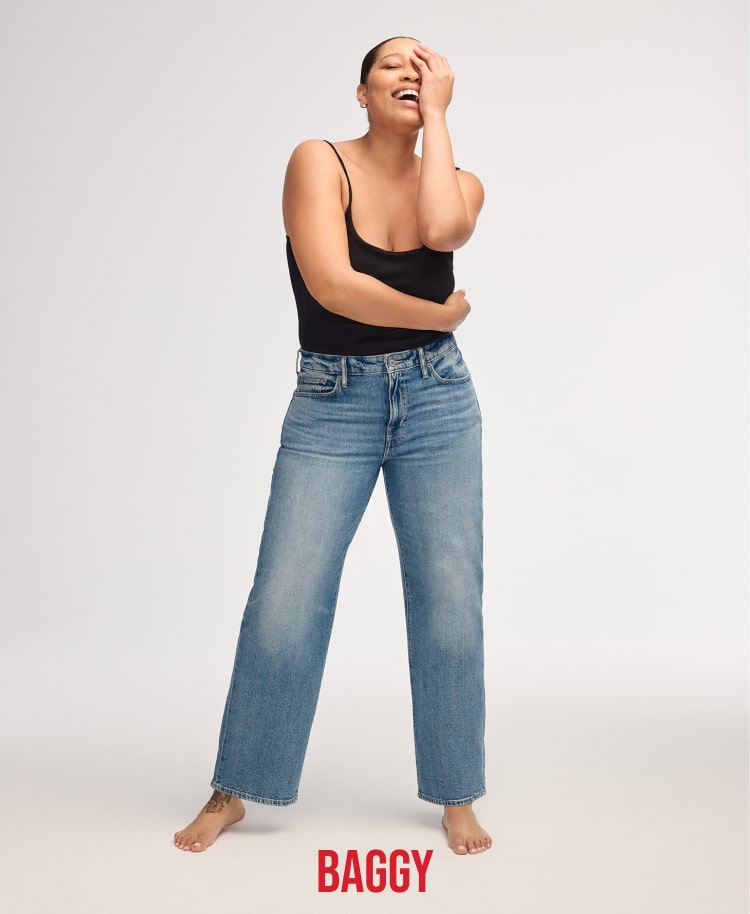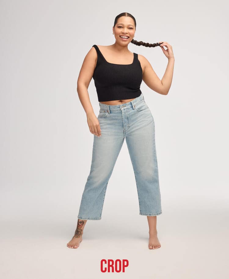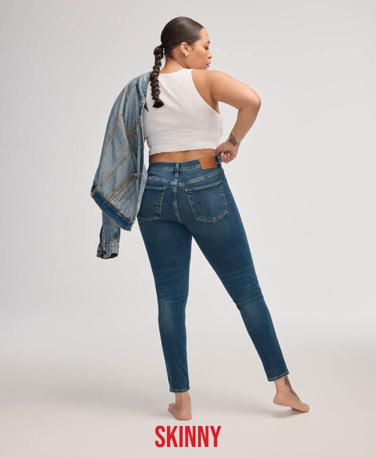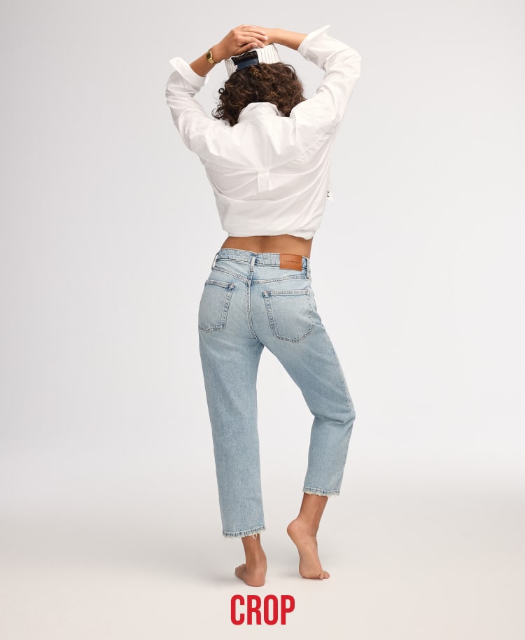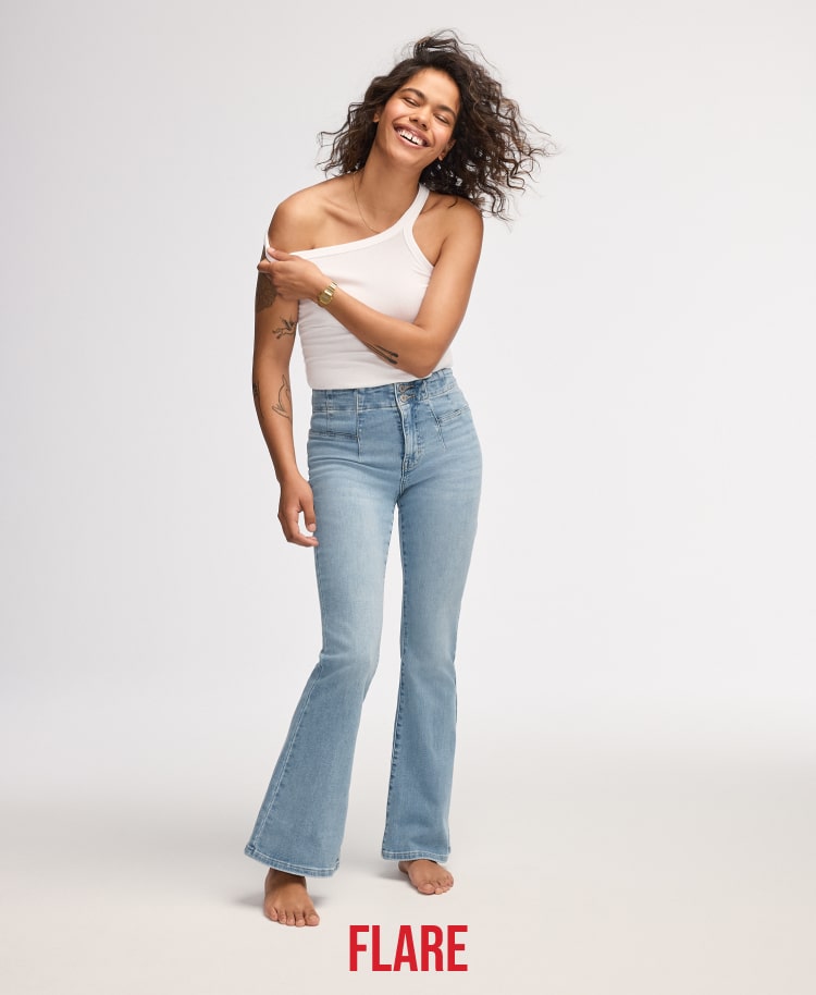 The fit you choose will depend on the look you're trying to achieve. Right now, there's a lot of popularity around mom jeans, high-waisted jeans, and flare jeans. These are all derived from the 80s and have a lot of personality. Mom jeans are a sub-category of high-waisted jeans because they have a high rise, but the key differentiator is in the leg - which stays a little looser all the way down. Mom jeans are a great casual choice for weekends and summer parties. You can also find high-waisted skinny jeans, which do a great job expressing your figure and have a more modern, clean look. These are popular choices for work, going out, and looking sharp. Flare jeans and bootcut jeans are just downright fun, with a bigger boot cutout for a retro vibe.