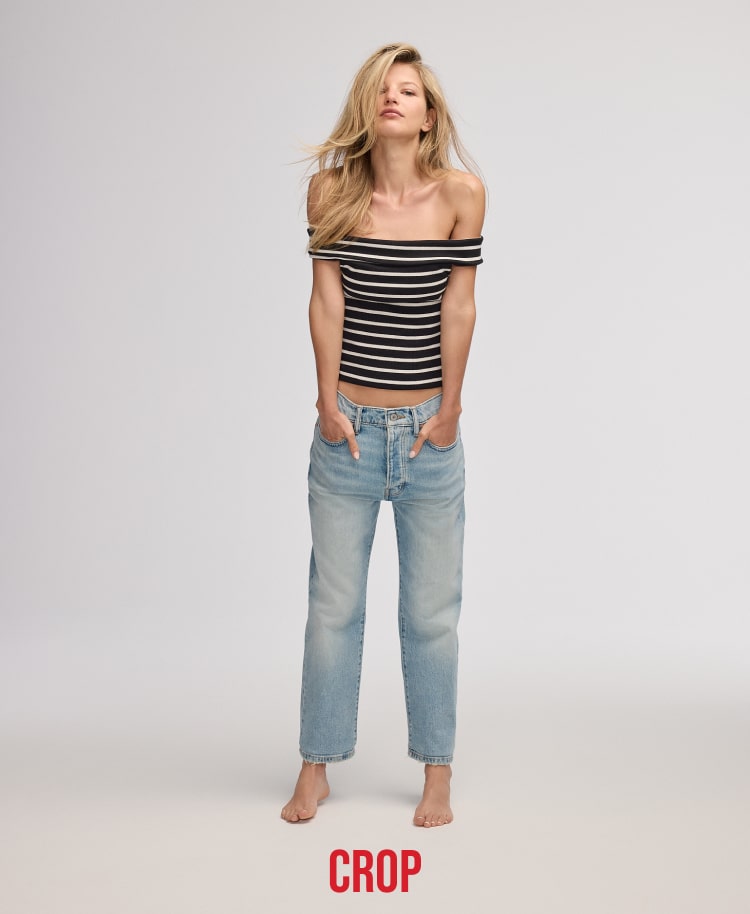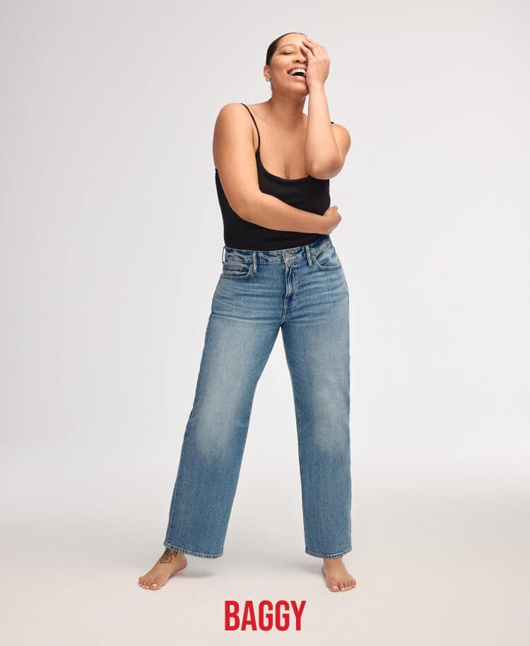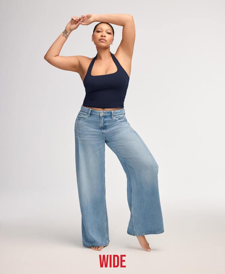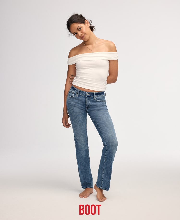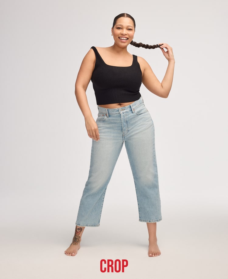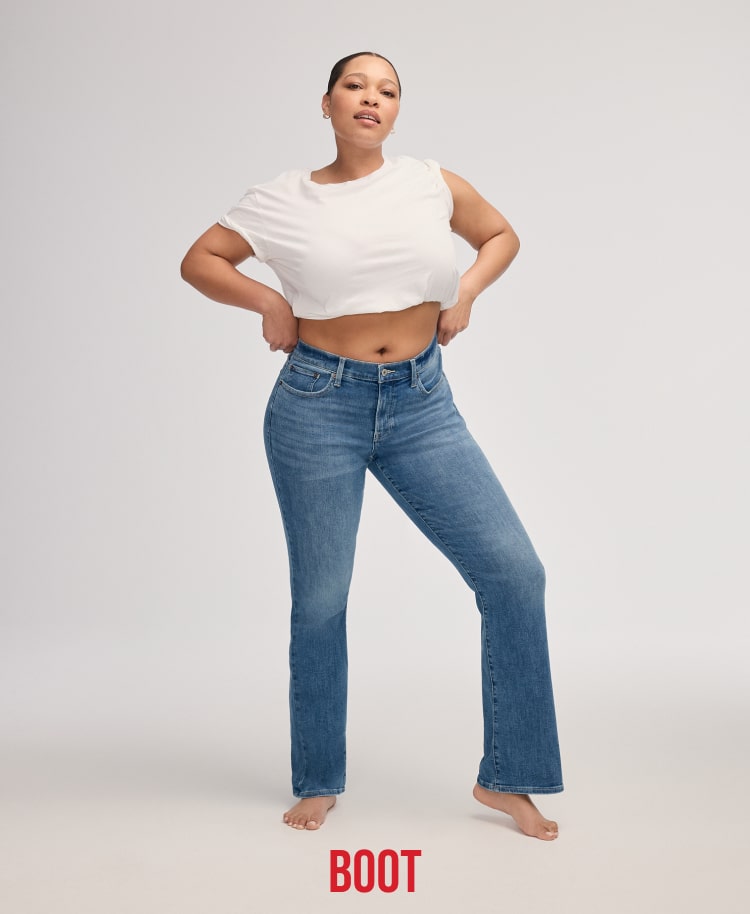 The fit you choose will depend on the look you're trying to achieve. Right now, there's a lot of popularity around mom jeans, high-waisted jeans, and flare jeans. These are all derived from the 80s and have a lot of personality. Mom jeans are a sub-category of high-waisted jeans because they have a high rise, but the key differentiator is in the leg - which stays a little looser all the way down. Mom jeans are a great casual choice for weekends and summer parties. You can also find high-waisted skinny jeans, which do a great job expressing your figure and have a more modern, clean look. These are popular choices for work, going out, and looking sharp. Flare jeans and bootcut jeans are just downright fun, with a bigger boot cutout for a retro vibe.